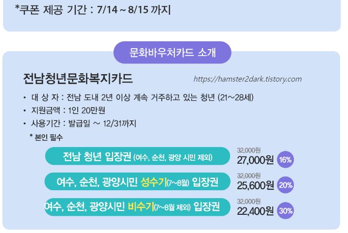 청소년진로체험행복카드 • 대 상 자 : 여수시 중1 재학생 및 학교 밖 청소년 • 요금 : 입장권 20,000원 / 종합권 23,000원 (중인할인요금) 기간 2022.3.1 - 2022.12.15 조건 00% 희망바우처 • 대 상 자 : 여