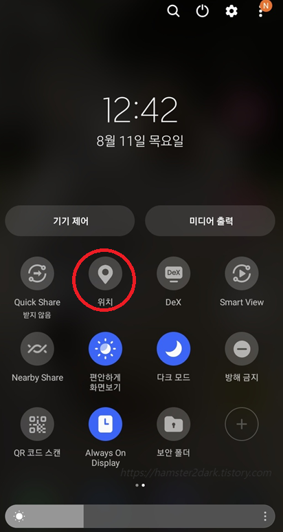 만약 내 위치 확인하기가 안 되신다면 'GPS'나 '위치'를 켰는지 확인해주세요. 아래 사진은 안 켜진 상태이며 '파랑'이 되면 켜진 상태입니다.