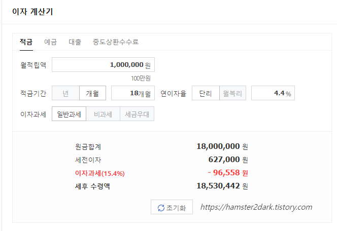 100만 원을 18개월 동안 납입한 이자를 4.4%로 단순 계산하면