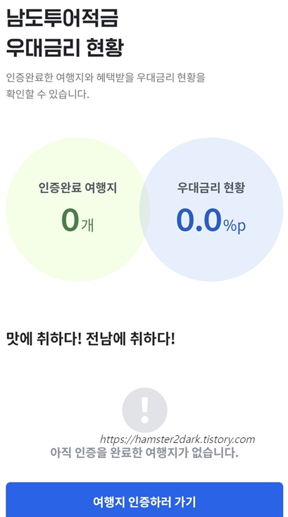 남도투어 적금 우대금리 현황 화면을 보시면 인증 완료 여행지와 우대금리 현황을 볼 수 있습니다. 막 가입해서 아직 완료한 여행지가 없네요~