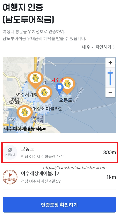 여수를 한 번 가시면 3개까지 찍을 수 있는 거죠. (한 관광지에 관광지 주소가 여러 곳이면 더 찍을 수 있는지는 확인 안 해봤지만...)