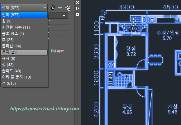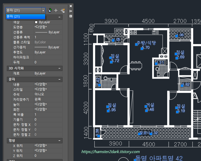 특성 창에서도 유형들을 보면 '문자(21)'이 전부이며 이 상태에서 스타일, 색상 변경뿐만 아니라 추가 명령어를 통해 객체를 삭제, 이동 등 다양한 작업을 수행할 수 있겠습니다.