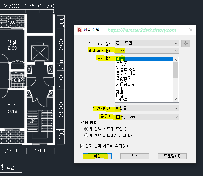 아까와 같이 문자만 선택하기 위해 '객체 유형', '특성' 등을 선택하여 '확인' 눌러주세요.