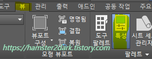 특성창은 '뷰' 탭의 '특성'을 클릭하여 여닫을 수 있고 Ctrl+1 단축키를 통해서도 가능합니다.