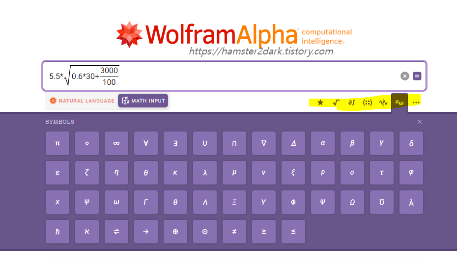 입력창의 우측 바로 하단의 버튼을 통해 다양한 시각 기호(루트, 분수, 로그, 파이 등등)를 입력할 수 있습니다.