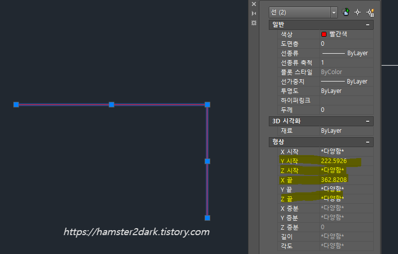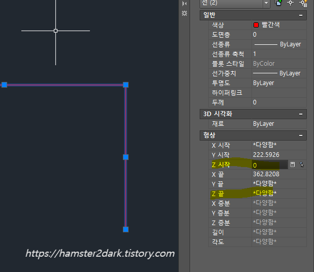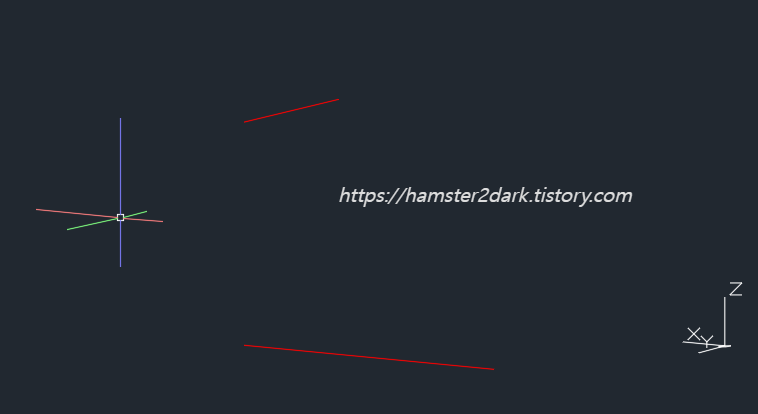 두 선을 선택하고 좌표 값을 자세히 보니 Z값이 다릅니다.