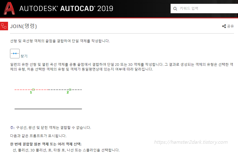 아래 사진은 JOIN 명령어에 대한 오토캐드의 설명. '선형 및 곡선형의 객체의 끝점을 결합하여 단일 객체 작성'