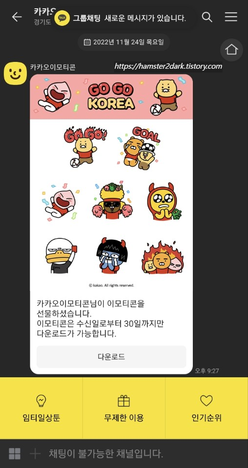 그리고 얼마 있지 않아 바로 이모티콘 다운로드 링크가 올 겁니다. 그러면 이제 얼른 축구 오픈 채팅방은 나갑시다.