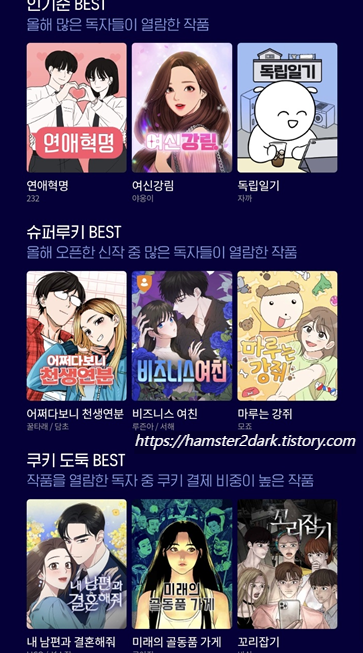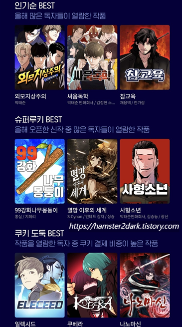 마지막에는 다른 독자님들의 BEST 웹툰을 보여준다. 여성, 남성 나눠져 있는데 나랑 겹치는거 하나도 없다. 내 취향이 마이너였나? 이럴 수가!!