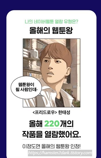 220개 가지고 '올해의 웹툰왕'이 되니 좀 멋쩍었다. 다른 사람들 보니 1000개 넘어도 같은 웹툰왕 열람유형이던데. 열람유형 좀 더 촘촘히 구현했어도 좋았겠다.(그러면 너무 복잡한가?)