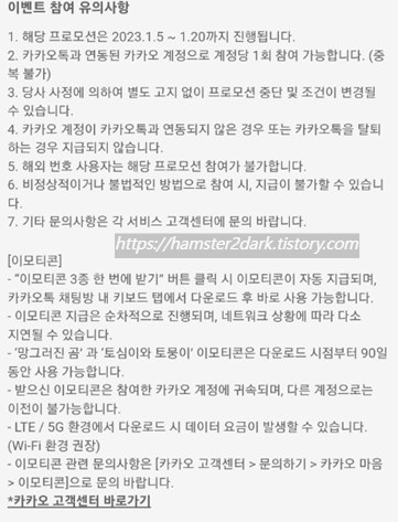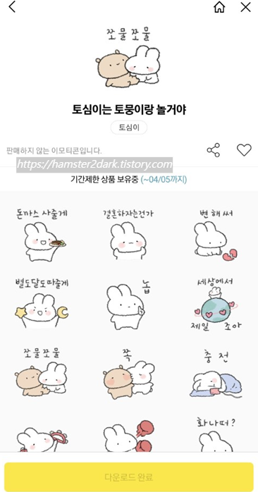 춘식이 이모티콘 외에도 '아기 망그러진 곰', '토심이는 토뭉이랑 놀거야' 다운로드하여 90일 이용 가능하다.