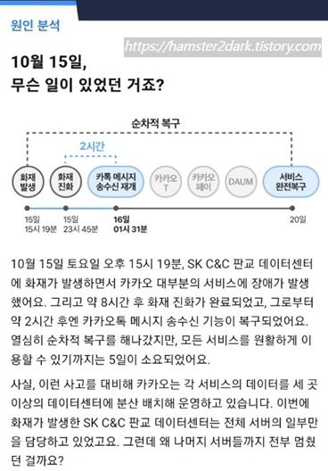 카카오톡은 물론이고 카카오 서비스들이 전체 먹통이 일어났다. 카카오톡은 비교적 빨리 복구가 되었으나 티스토리는 복구가 되기까지 꽤 오래 걸렸는데... ㅠㅜ