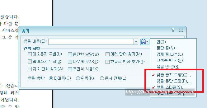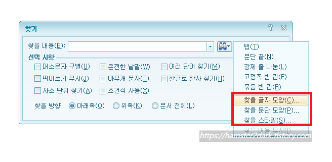 망원경 아이콘을 클릭하시면 '찾을 글자 모양', '찾을 문단 모양', '찾을 스타일' 등이 뜹니다.