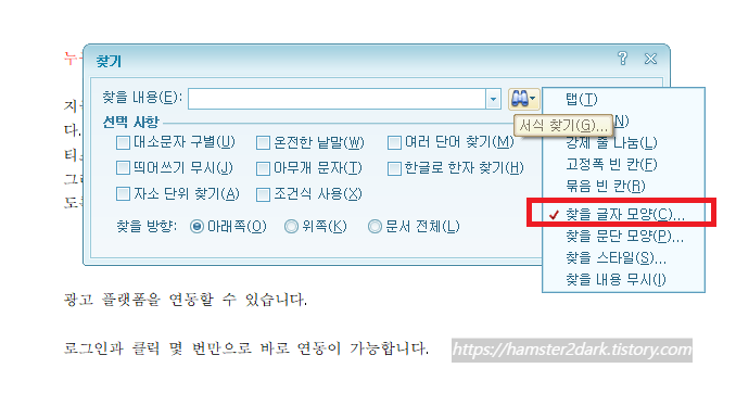 이때 우리가 자주 사용하는 Ctrl+F 기능을 사용해서 글자 모양, 색깔, 스타일 등으로 '찾기' 기능을 쓸 수 있다는 사실!