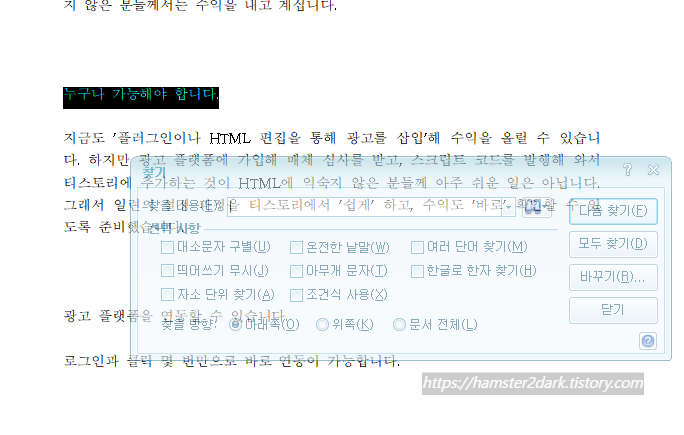 그리고 '바꾸기' 버튼을 이용해 단어를 대체하기도 매우 쉽죠.