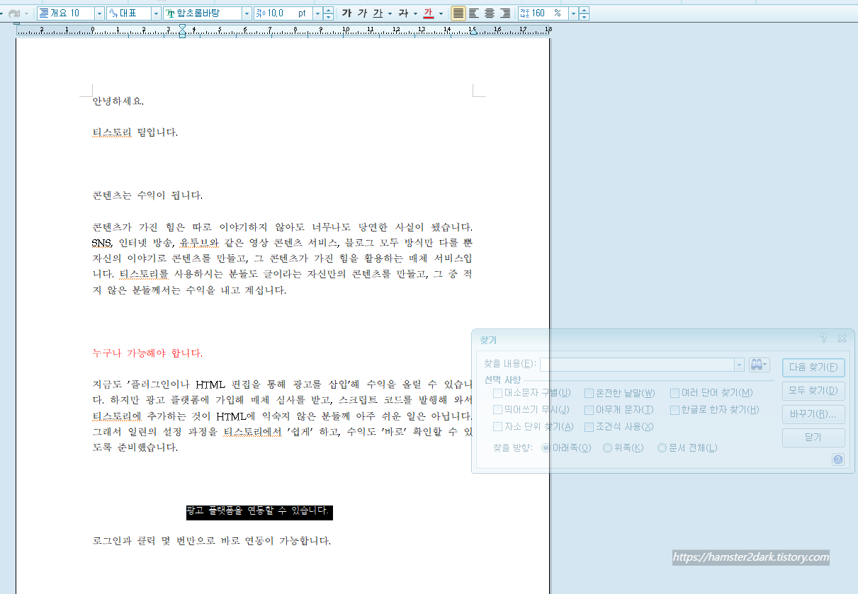 예시 내용은 티스토리 공식 홈페이지에 있는 글입니다. '누구나 가능해야 합니다.'를 빨갛게 만들어보았습니다.