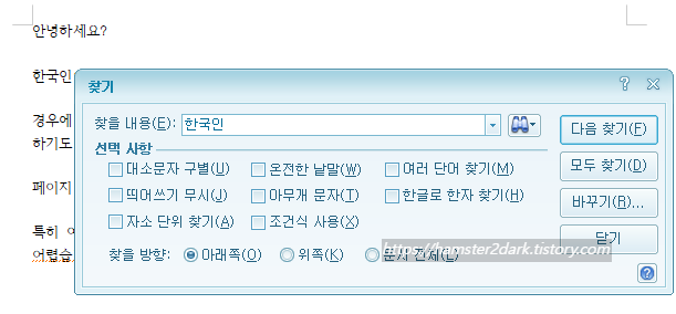 찾기 버튼을 누르면 위 사진처럼 '찾는 단어(한국인)'에 드래그가 됩니다.