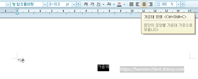 글자뿐만 아니라 글자처럼 취급한 그림, 표 또한 가운데 정렬을 많이 이용하죠. Ctrl+Shift+C 누르면 됩니다.