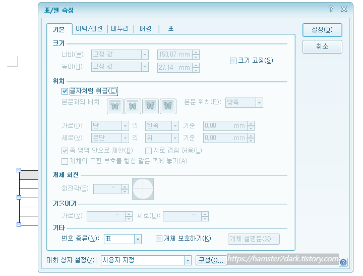 표나 그림을 클릭한 상태로 'P' 누르면 '표/셀 속성'이 켜져요.