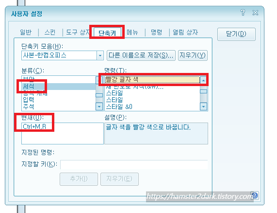 단축키 탭->분류: 서식->명령 : 빨강 글자 색