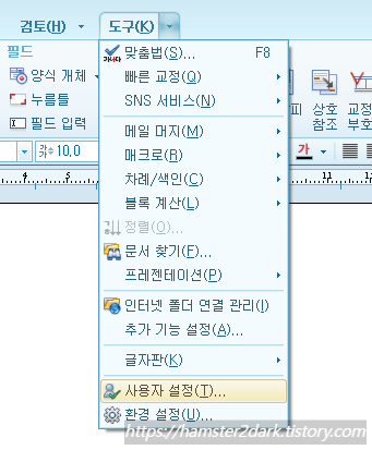 지정된 단축키를 확인하기 위해서 '도구 탭-사용자 설정'으로 가줍니다.