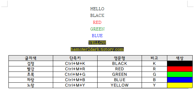 보시면 아시겠지만 글자색 변경의 단축키의 공통점은 "Ctrl+M"+특정 색깔입니다.