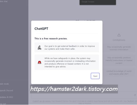 무사히 로그인을 완료하시면 아래와 같이 ChatGPT 시작 전 문구를 볼 수 있습니다. 영문입니다.