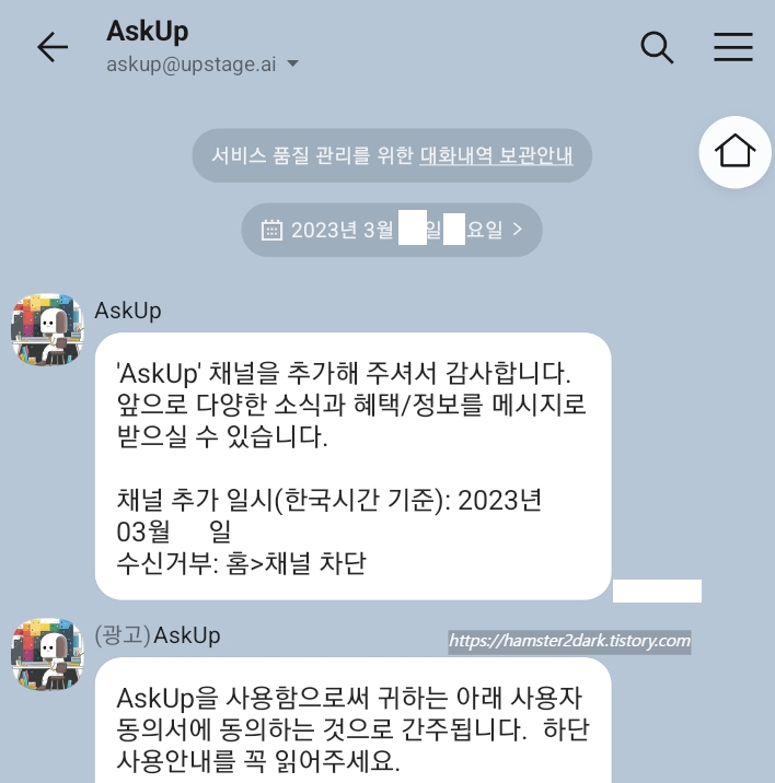귀하가 아래 사항에 동의를 하는 경우에만 AskUp과 대화를 시작해 주세요. AskUp 이용을 원치 않는 경우 채널에서 나가실 수 있습니다.