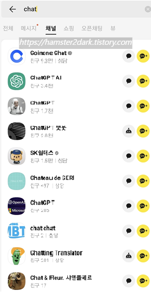 *단 Chat GPT를 찾을 요량으로 검색하시면 다음과 같이 뜨는데요. 친구 수도 별로 없고 공식도 아닌 거 같은 게 꽤 많아 보였습니다. 채팅봇일 수도 있지만 그냥 ChatGPT 정보나 주는 것일 가능성이 있어서 이건 스킵했습니다. 그나마 맨 윗 상단이 공식적 이어 보이는데 저 회사의 채팅봇으로 추정됩니다.
