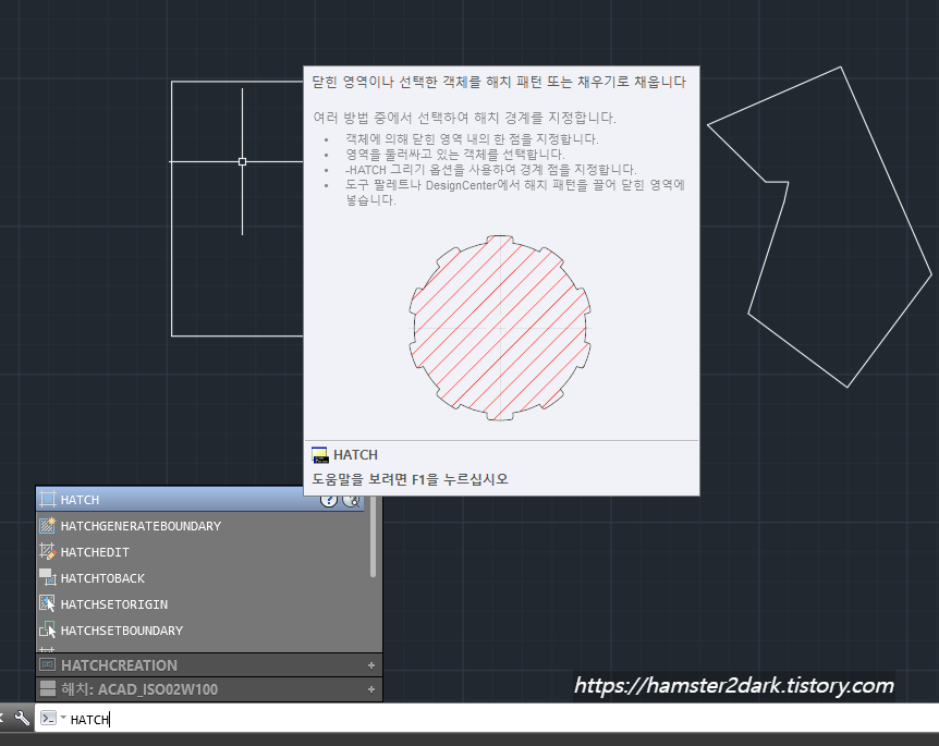 사용방법은 간단합니다. Hatch 명령어를 입력해줍니다. 보통 ha 정도만 입력해도 자동완성되지만 안 뜬다면 문자를 더 입력해 주세요.