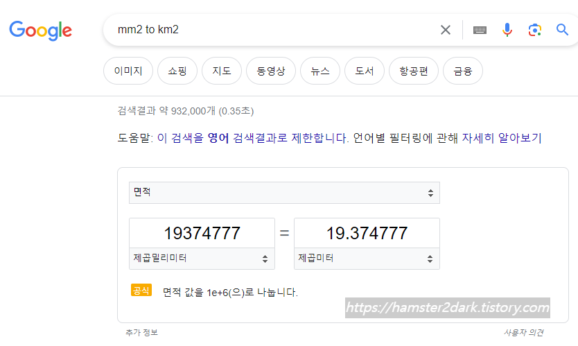 위 사진은 km2로 검색해 놓고 결과 단위를 제곱미터로 재변경해 주었습니다.