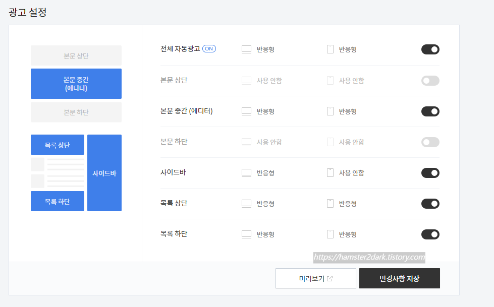 티스토리 자체 광고는 본문 상단 혹은 하단 중 한 곳에 랜덤으로 노출되므로 제 광고랑 겹치지 않기 위해 해제해 줍니다.