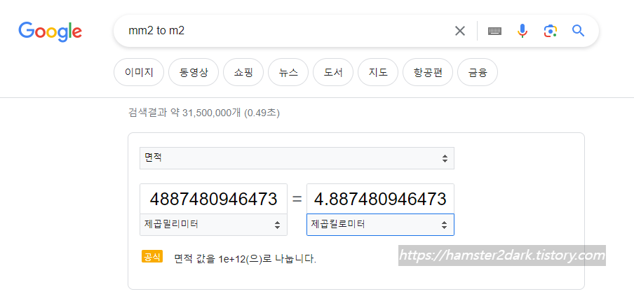 저처럼 구글에 mm2 to km2(원하는 단위)를 검색하여 값을 입력해 주면 원하는 단위로 환산된 결과를 얻을 수 있습니다.