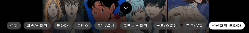 학원/판타지, 드라마, 로맨스, 코믹/일상, 로맨스 판타지, 공포/스릴러, 액션/무협, 판타지 드라마