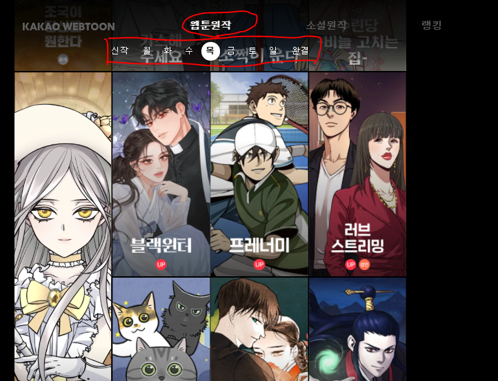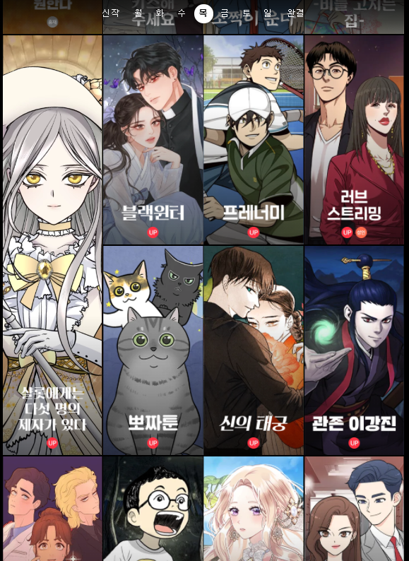 스크롤을 위나 아래로 하시면 요일이 자동으로 바뀌면서 웹툰들이 보여집니다.