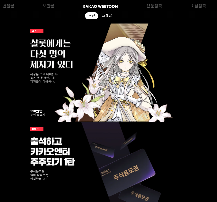상단에 선물함, 보관함, 웹툰원작, 소설원작이 있는데요.