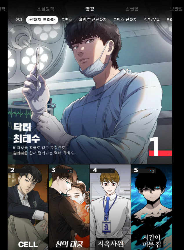 또는 웹툰 원작 탭의 두번째 오른쪽에 있는 랭킹에서 웹툰을 골라볼 수도 있습니다.