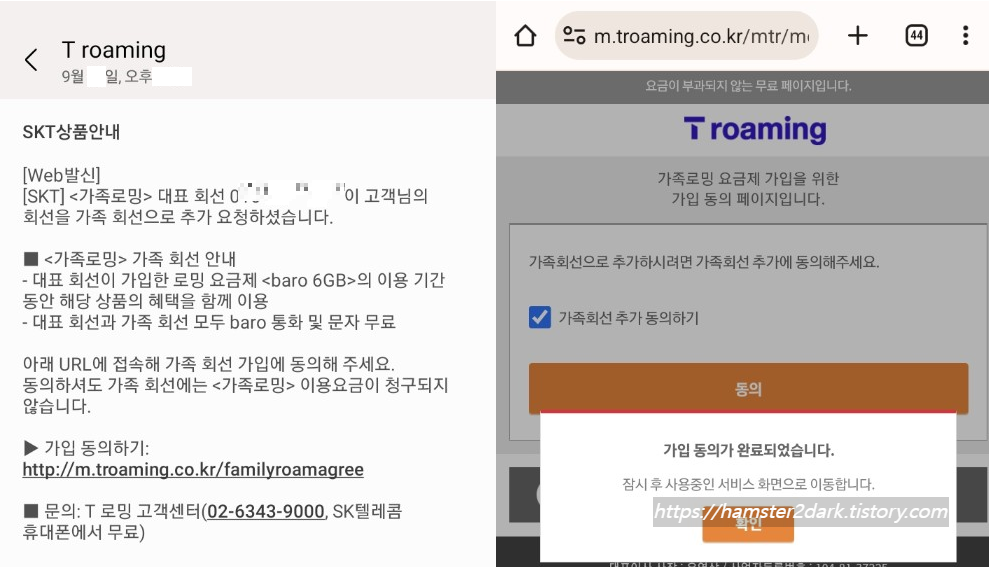 가족 구성원은, 문자 메시지로 날아온 링크로 들어가서 가입 동의하면 됩니다.