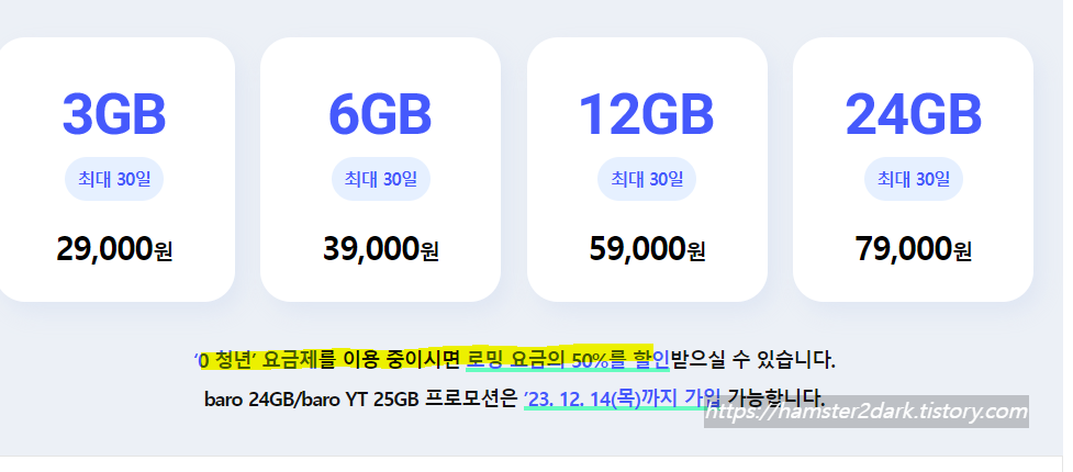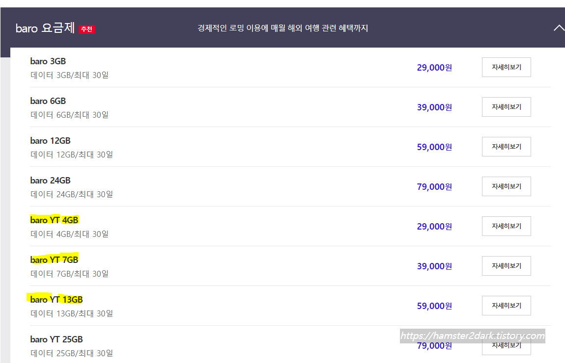 | 29,000원 | 3GB, 7일 | 3GB, 30일 |