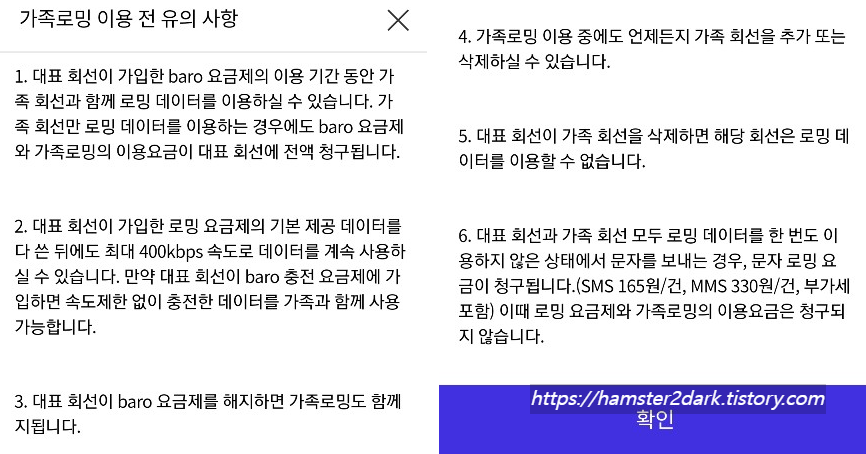 - 대표 회선의 이용기간 동안 함께 이용 가능하고 가족 회선만 로밍데이터 이용해도 대표 회선에 전액(baro요금제+가족로밍요금) 청구됨