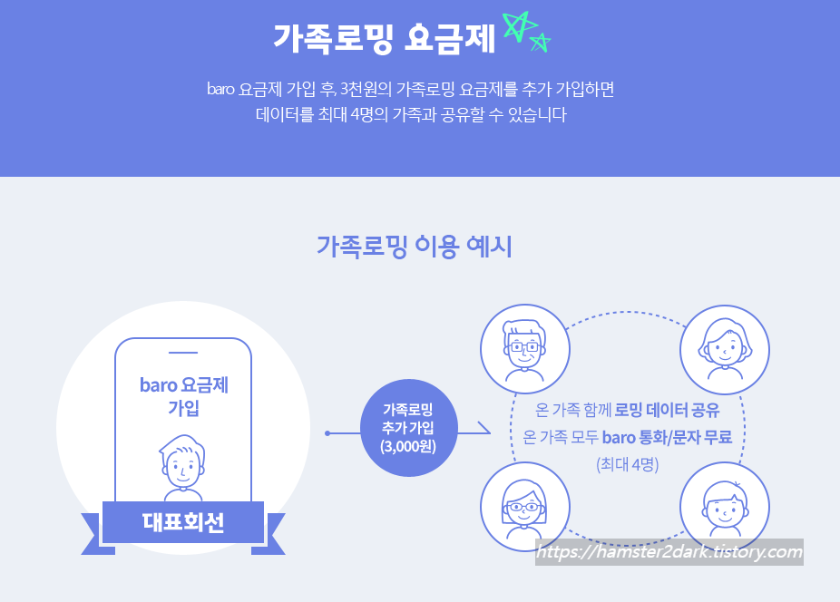 (최대 추가 가족 4명으로, 대표자 포함 5인). 가족로밍으로 로밍을 얻어 쓰는 가족들은 추가요금 없습니다.