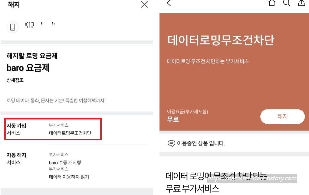 해지 시 자동으로 데이터 로밍 무조건 차단에 가입된다. 이 상태에서 가족 로밍 요금제 동의하면 가족회선으로 들어갈 수 있다.