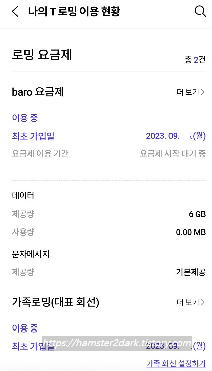 국내에서 가입완료 후 화면은 다음과 같습니다. baro 요금제와 가족로밍이 T로밍 이용현황에 뜹니다. (아래 사진은 대표회선 해외 출국 전 기준)