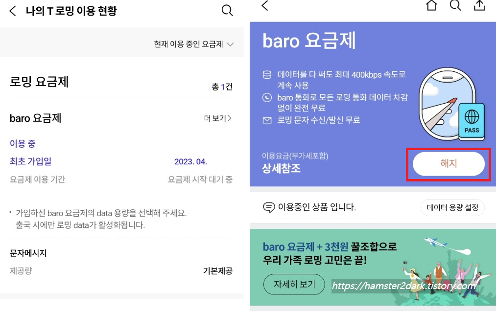 2023.04.26 - [2퍼센트의 지식 뽐내기] - 해외여행 SKT 로밍 요금제 가입 후기(feat. baro YT 4GB, 50퍼 할인)