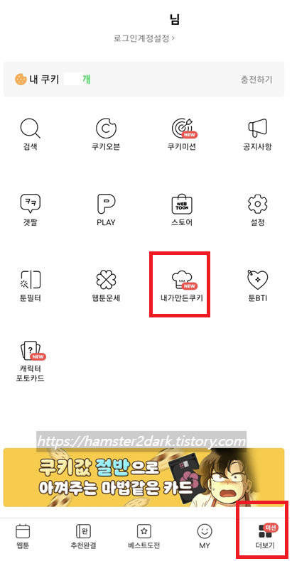 참고로 '내가 만든 쿠키'는 네이버 웹툰 어플의 오른쪽 하단의 '더 보기'에서 '내가 만든 쿠키'로 페이지 입장가능합니다.