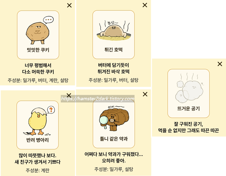 튀긴 호떡, 황천 병아리 모닝빵, 구름 구름 구름 빵, 밋밋한 쿠키