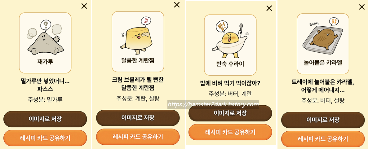 재가루, 달콤한 계란찜, 반숙 후라이, 눌어붙은 캬라멜