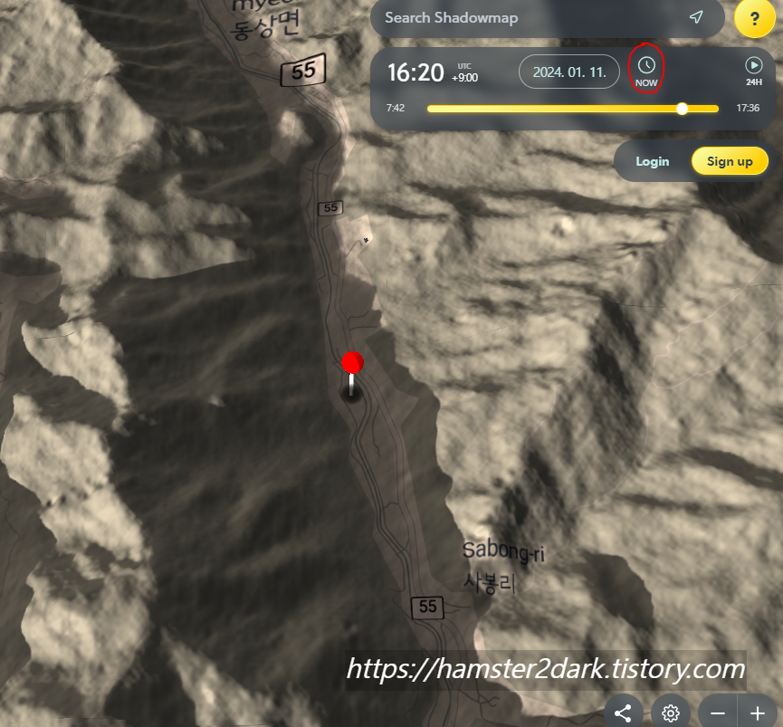 NOW 버튼을 눌러 현재 시간대의 음영도 확인 가능하고,