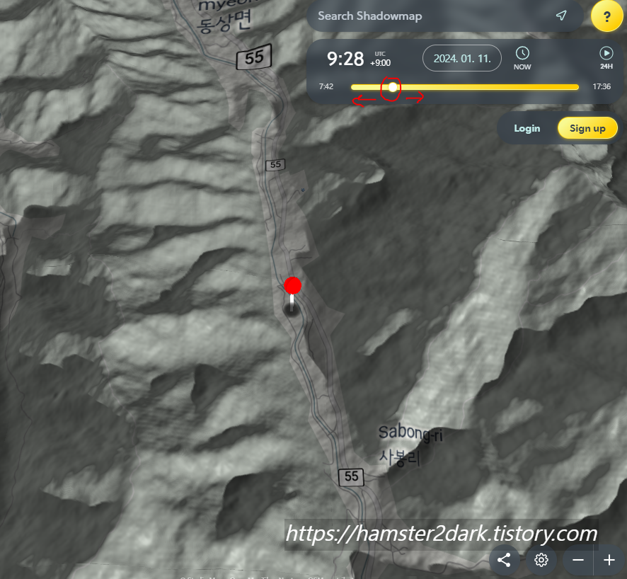 인터넷 글들을 보니 스케치업을 통해 시간대별로 지형의 음영을 확인한다고 하더라고요. 근데 문제는 스케치업이라는 프로그램을 깔아야하고 지형 정보도 입력, 태양 정보도 입력해야 하는 그 과정이 만만찮아 보여 포기. (말이 입력이지 노가다일 수 있음)
