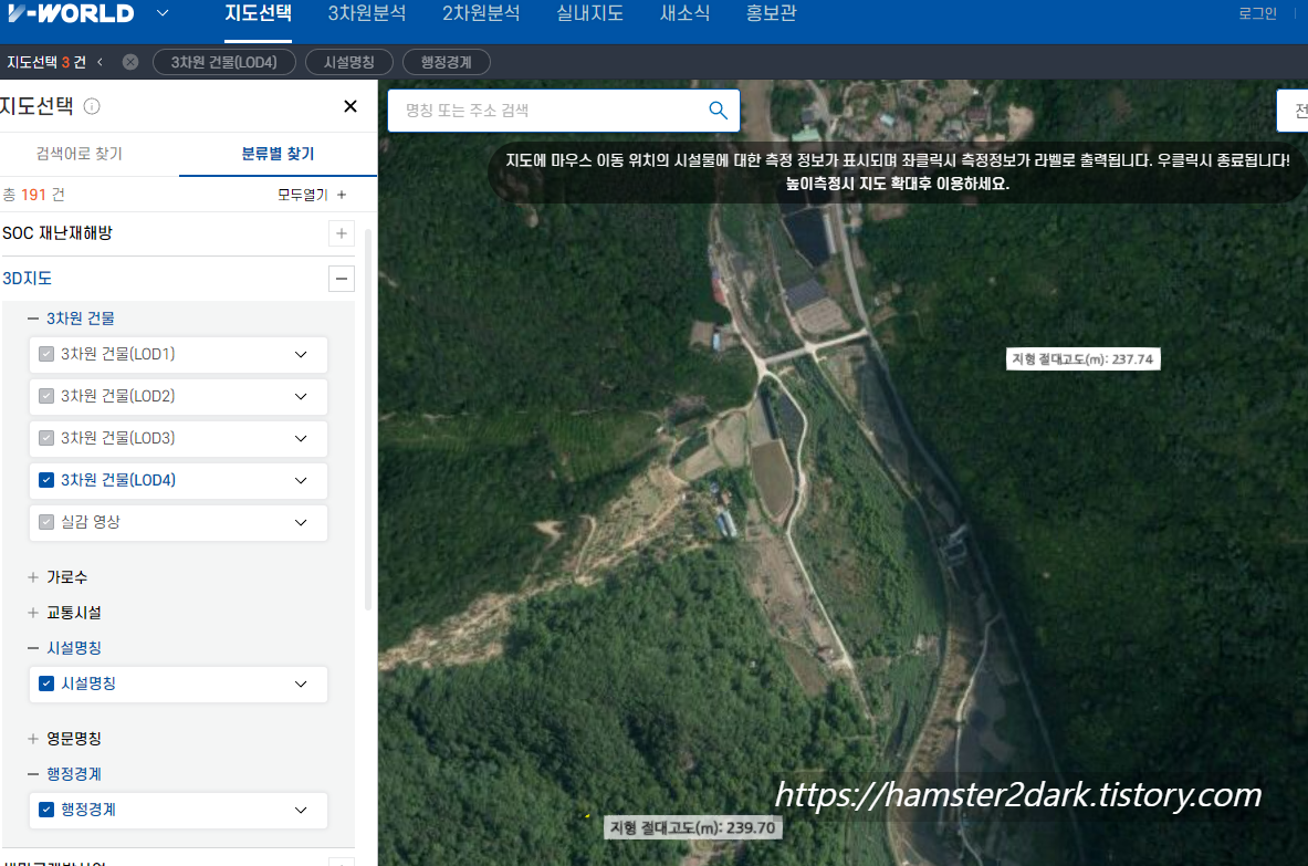 3차원 분석 탭이 있길래 3차원 모델링으로 확인가능한 줄 알았는데 2D 지도랑 다를 바 없었습니다. 제가 원하는 위치만 안 된 것일 수도 있지만 사용법도 복잡해 보여서 포기.
